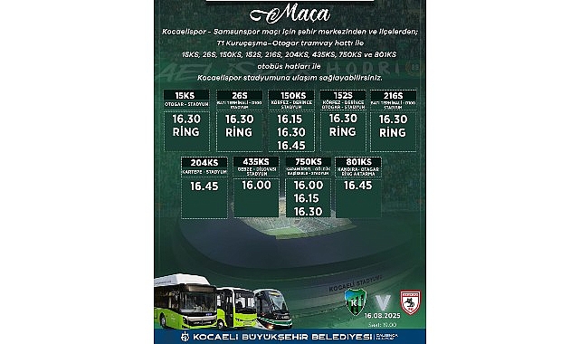 Büyükşehir Belediyesi Ulaşım Dairesi Başkanlığı tarafından yapılan düzenleme ile birlikte 16 Ağustos Cumartesi günü (yarın) saat 19.00’da Kocaeli Stadı’nda oynanacak karşılaşma öncesinde İzmit merkez başta olmak üzere Gebze, Dilovası, Derince, Körfez, Başiskele, Gölcük, Karamürsel ve Kartepe ilçelerinden stada doğrudan ulaşım sağlayacak özel otobüs hatları hizmet verecek.